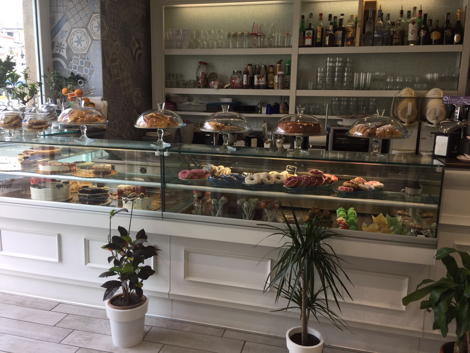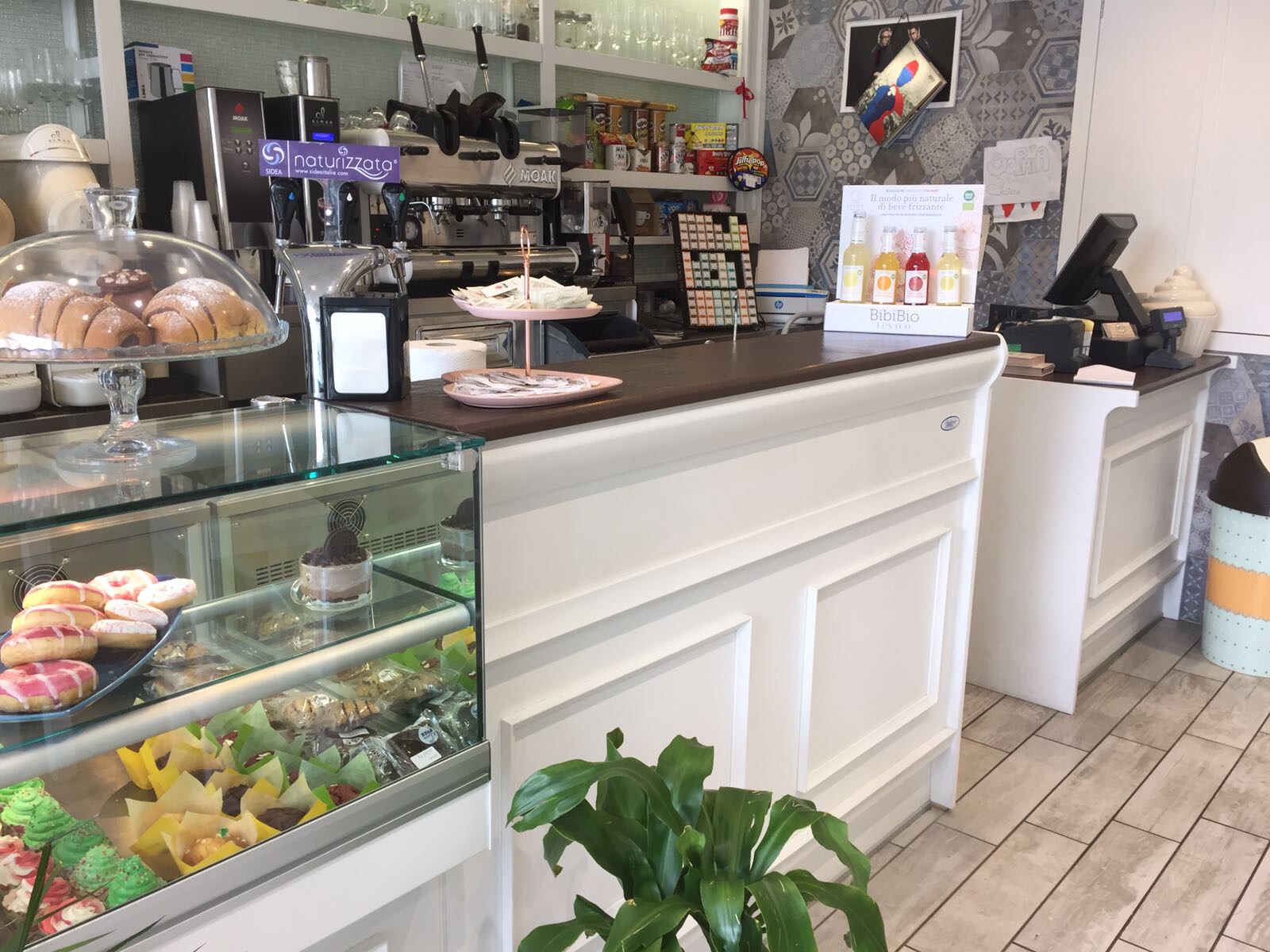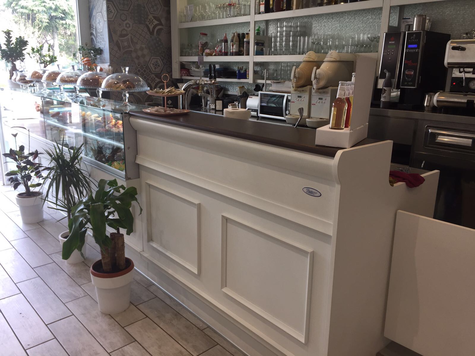 Locale completo in stile americano per la distribuzione di prodotti sia dolce che salato con vetrina ad angolo refrigerata + vetrina lineare modello snack a vetri bassi dritti, nonchè banco ber e cassa finale. Il locale completamente bianco con nuance di colore brown, riprende lo stile provenzale con credenze posteriore e luci calde